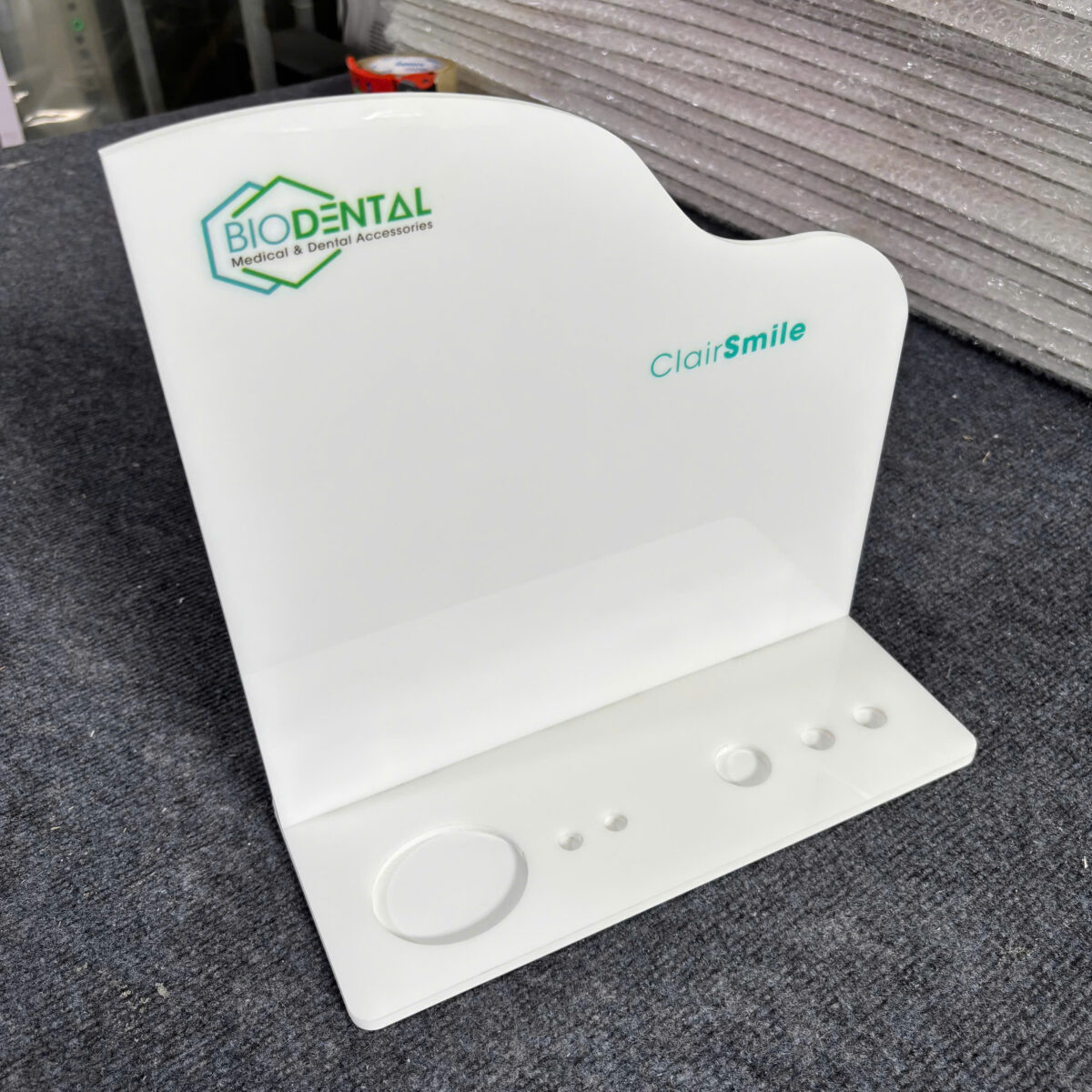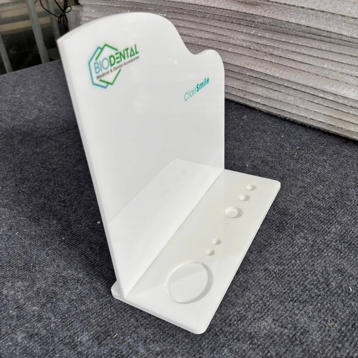 Kệ trưng bày được gia công từ mica trắng sữa, thiết kế dạng chữ L chắc chắn, bề mặt mịn và bo góc an toàn. Phần đế có các vị trí định hình giúp đặt sản phẩm nha khoa (ống, lọ, dụng cụ nhỏ) gọn gàng. Logo và thông tin thương hiệu được in UV trực tiếp, đảm bảo sắc nét và bền màu.